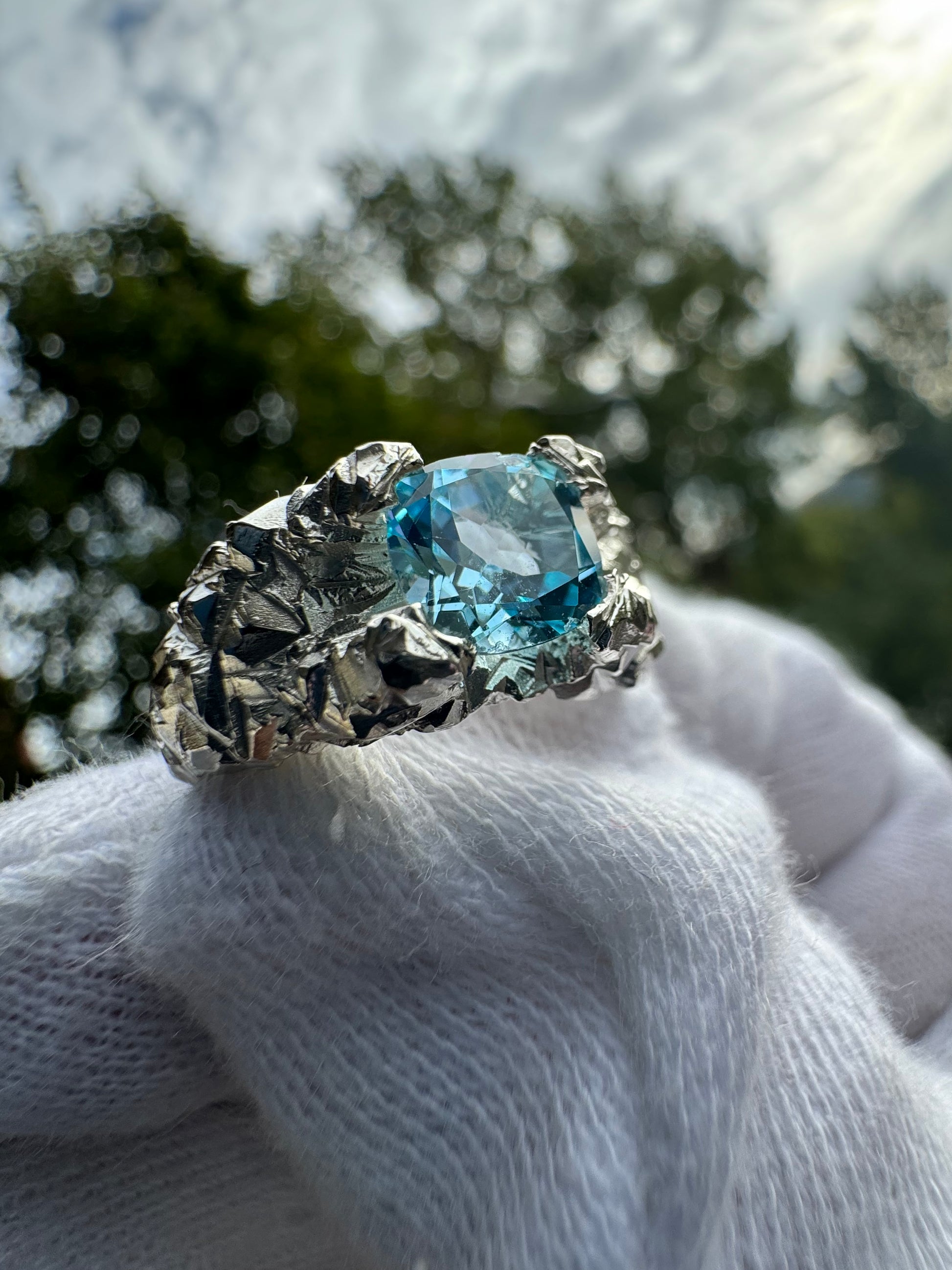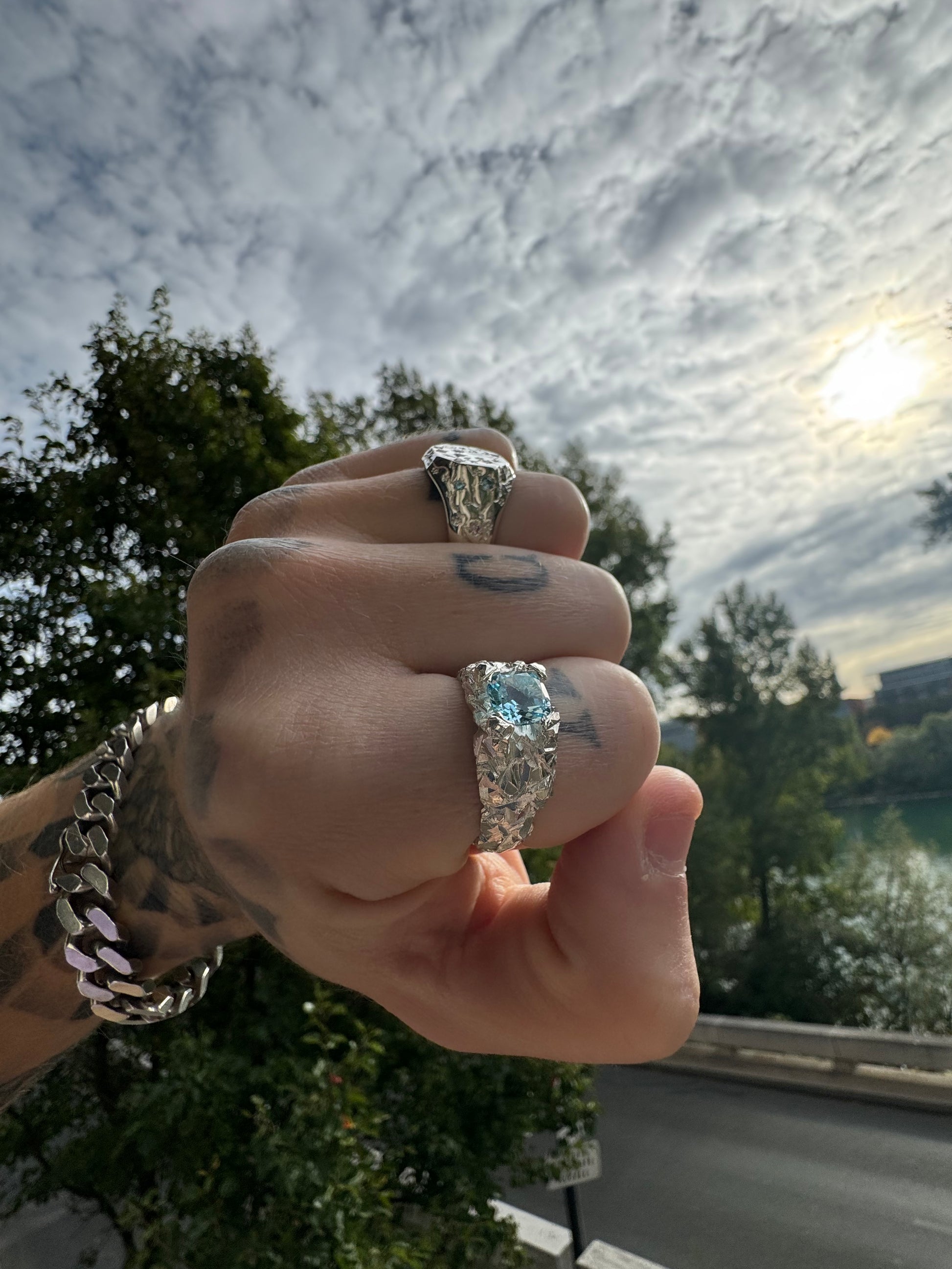 Bague en argent massif faite main avec une magnifique topaze centrale couleur "Swiss blue". Cette création est texturée à la main pour évoquer une surface minérale, rocheuse, le berceau même des pierres précieuses.