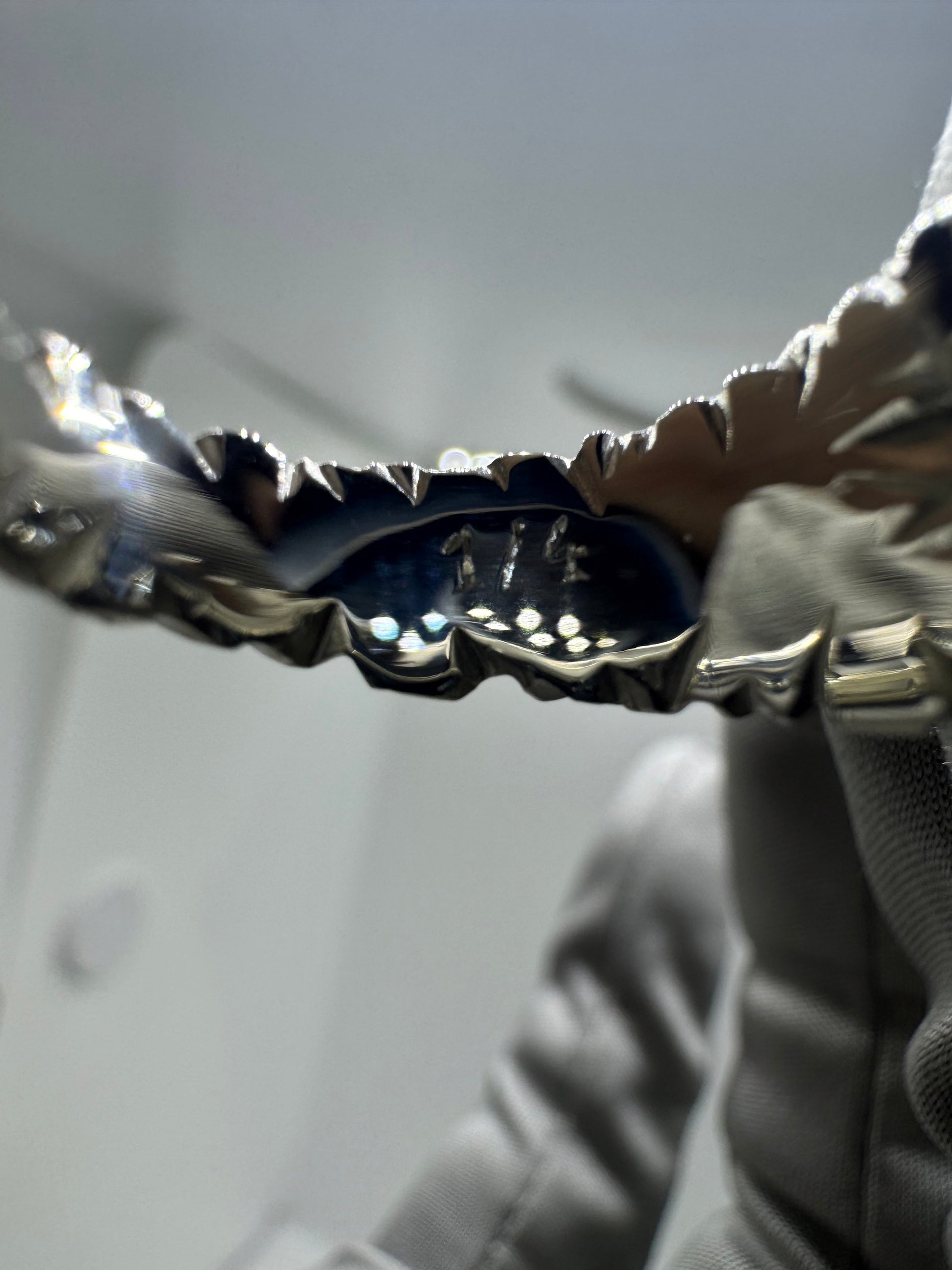 Collection limitée à 4 pièces numérotées avec une tanzanite naturelle sertie en son centre, 3 topazes London blue serties sur les côtés, le tout dans une texture rocheuse.