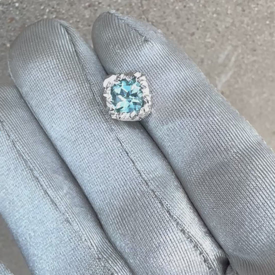 Une texture rocheuse avec une topaze naturelle taille coussin rappelant l’eau glacée