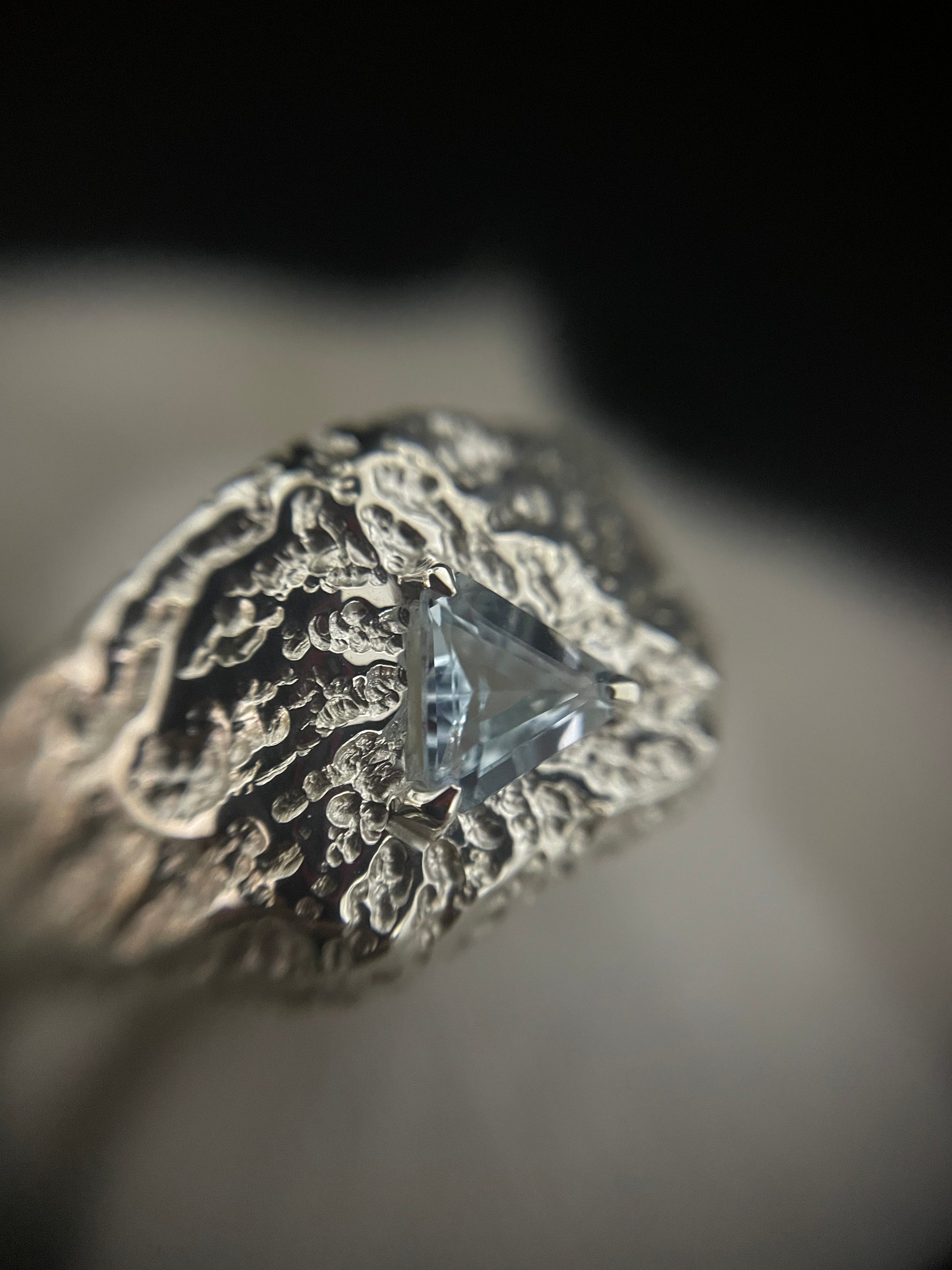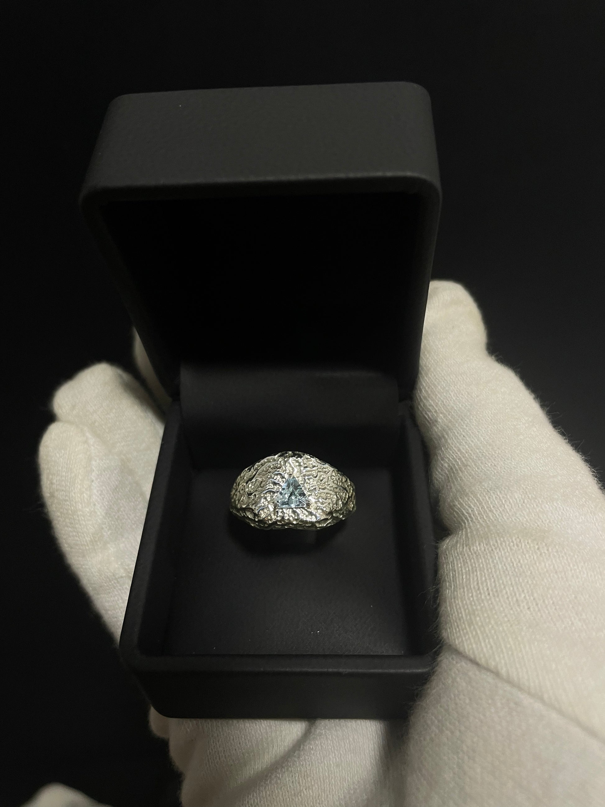 Chevalière en argent massif sertie d'une topaze naturelle taille triangle coupé.