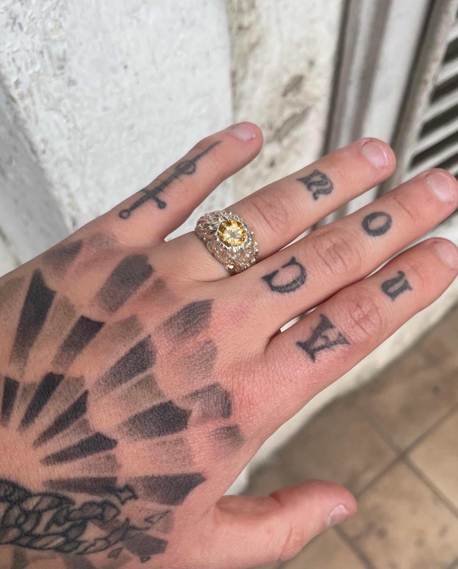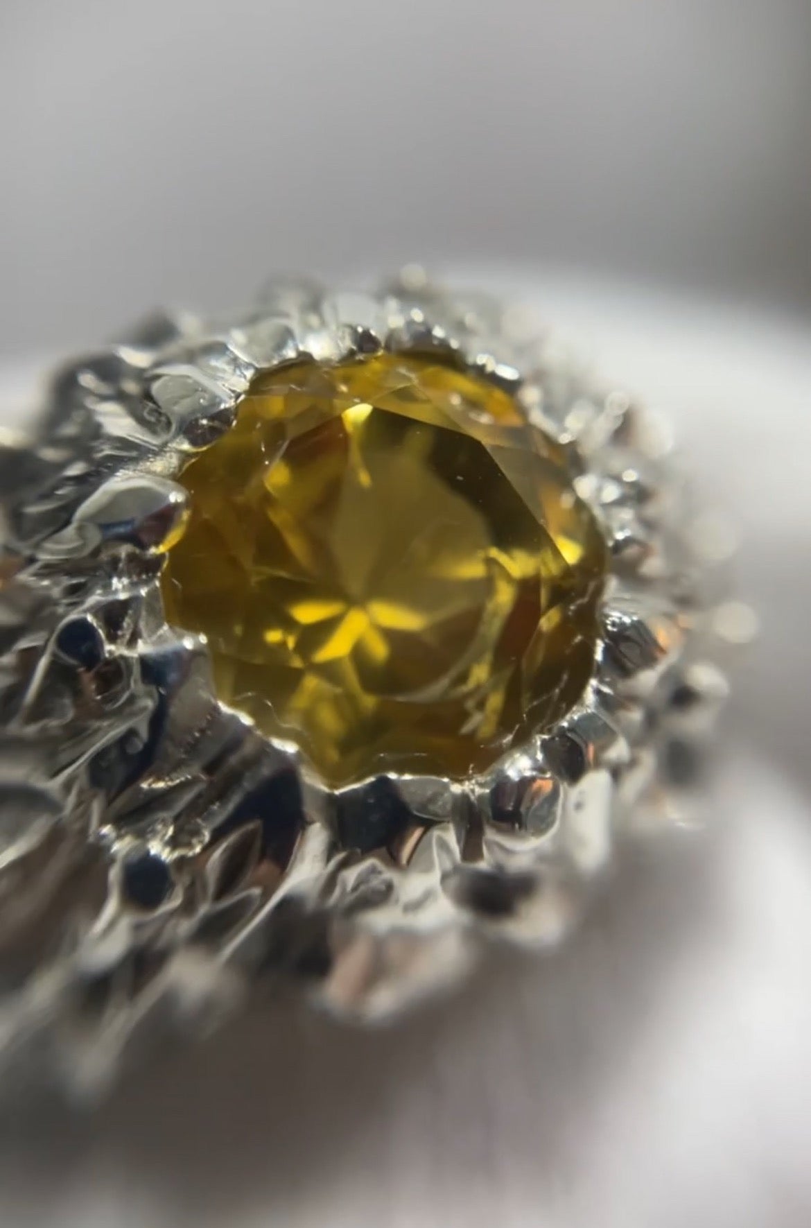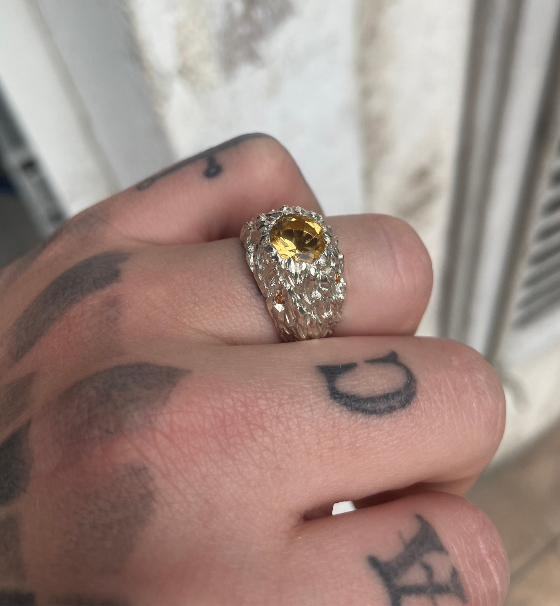 Chevalière faite main en argent 925 avec une citrine taille brillant de 9mm de diamètre ainsi que 3 saphirs oranges naturels. Texture rocheuse sculptée a la main avec un coeur de lave en pierre précieuse.