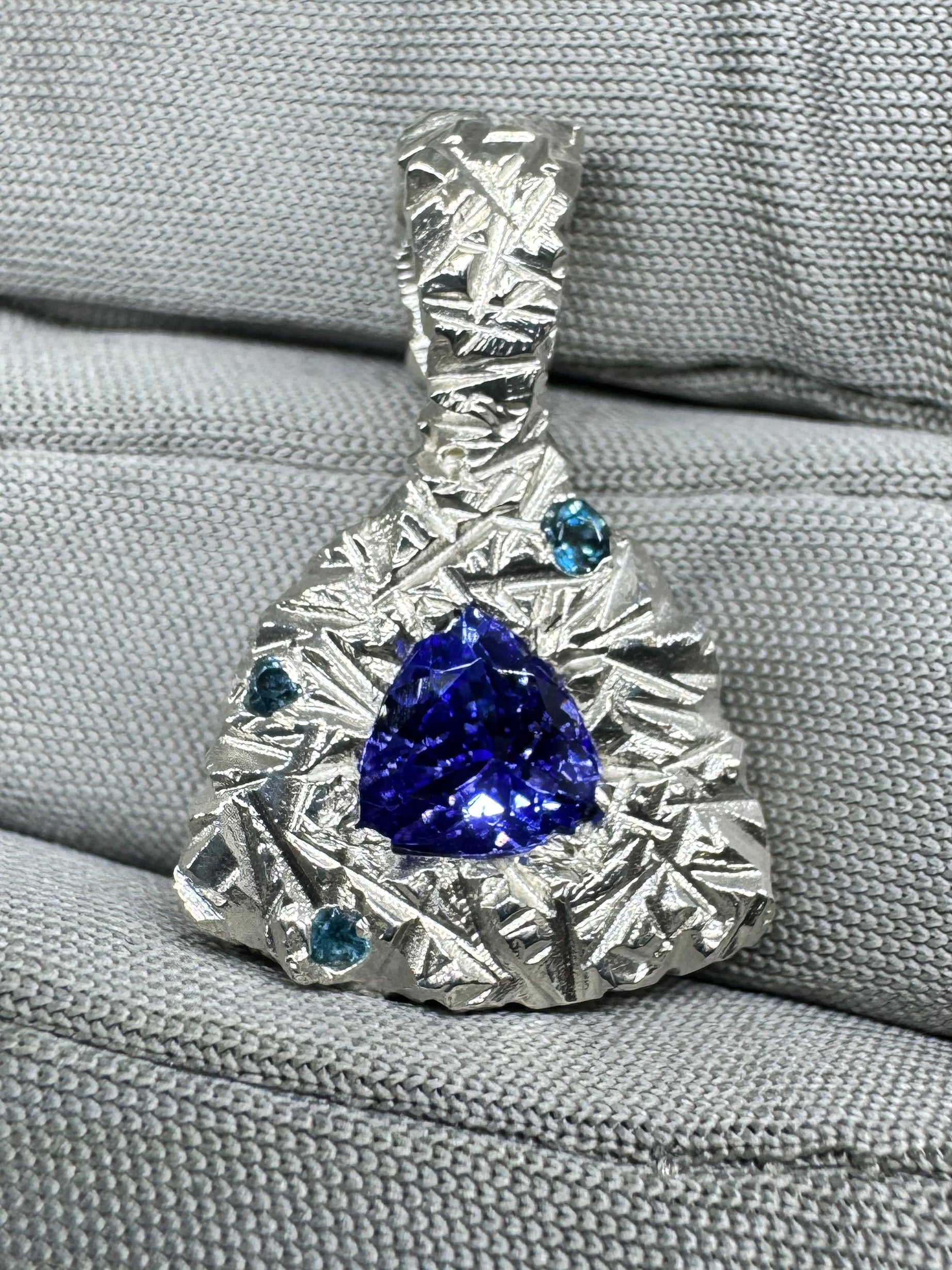 Collection limitée à 4 pièces numérotées avec une tanzanite naturelle sertie en son centre, 3 topazes London blue serties sur les côtés, le tout dans une texture rocheuse.